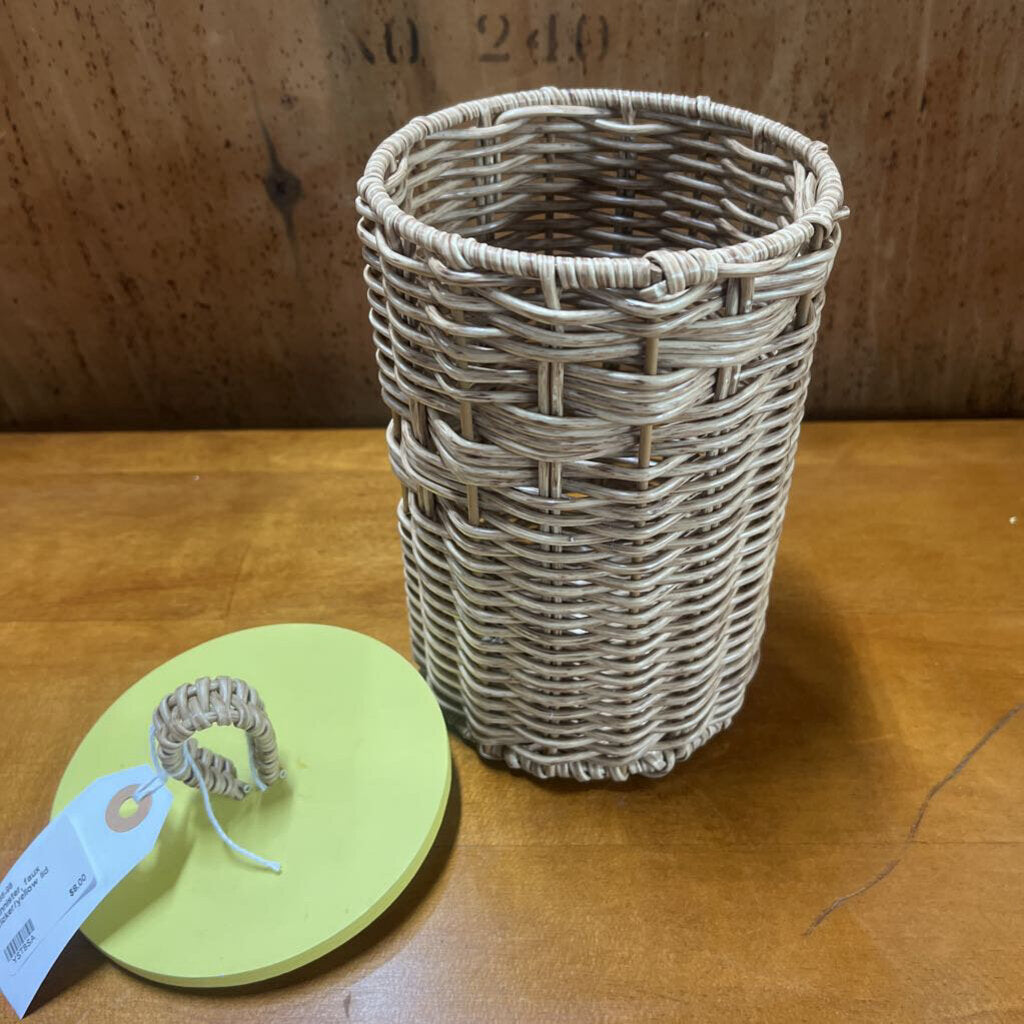 CANNISTER, FAUX WICKER/YELLOW LID