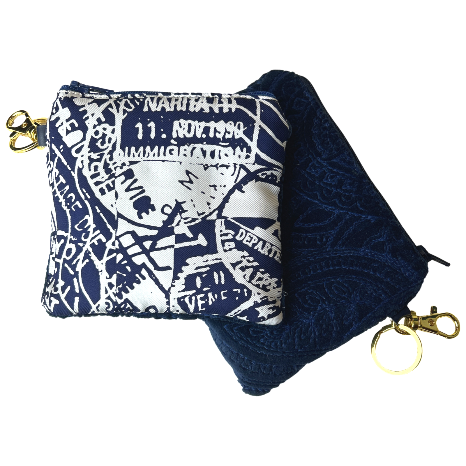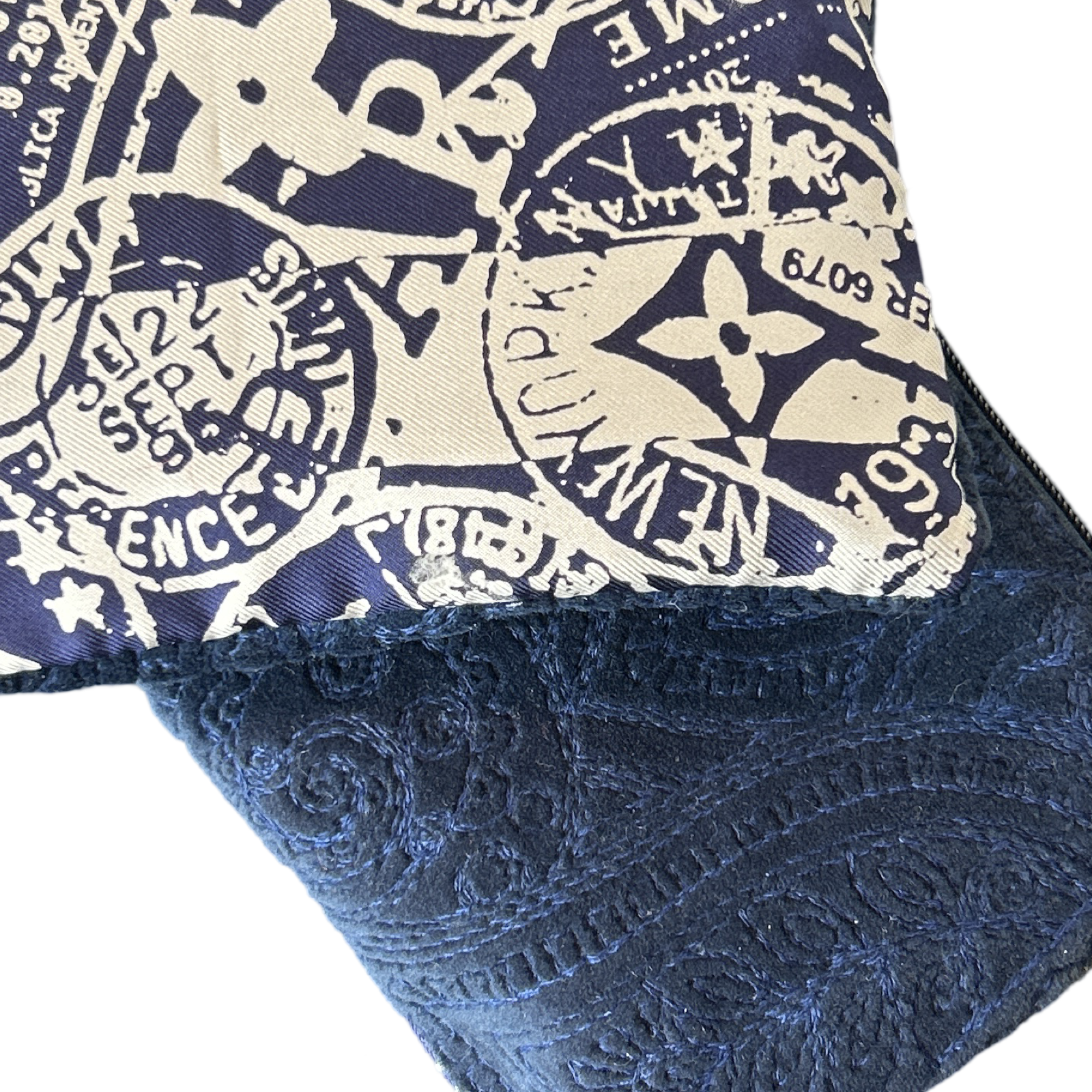 Vintage Louis Vuitton Travel Stamps scarf front paired with blue dot velvet reverse. Fully lined, zippered closure with removable gold-tone keyring and lobster clasp